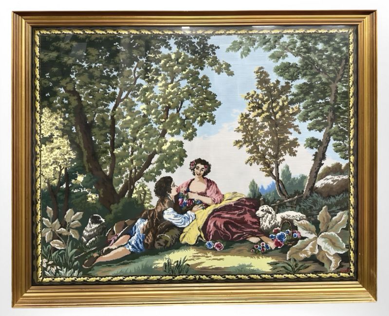A gilt framed tapestry depicting lovers by a tree, 150 cm x 120 cm.