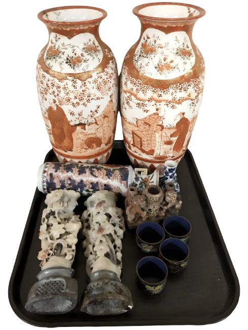 A pair of late 19th century Japanese Kutani porcelain vases, height 34 cm, (restored) together with a pair of Chinese carved soapstone vases, set of four cloisonne napkin rings, etc.