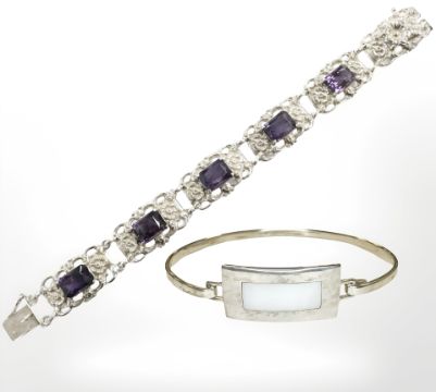 A silver and synthetic amethyst bracelet, length 18cm, and a further silver and mother of pearl bangle. (2)