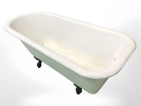 An enameled metal roll top bath on cast iron claw and ball feet, 172 cm x 78 cm x 64 cm.