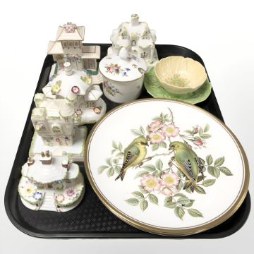 A group of Coalport porcelain houses, four Spode garden birds porcelain plates, a Carlton Ware dish and a Minton Marlow preserve pot.