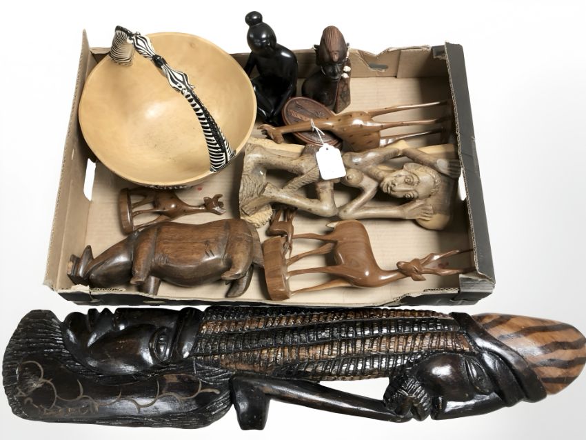 A group of African hardwood carvings, figurines, bowl, etc. (1 box)