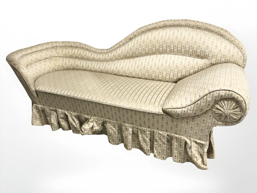 An early 20th century chaise longue in striped floral cream and gold fabric, length 205 cm
