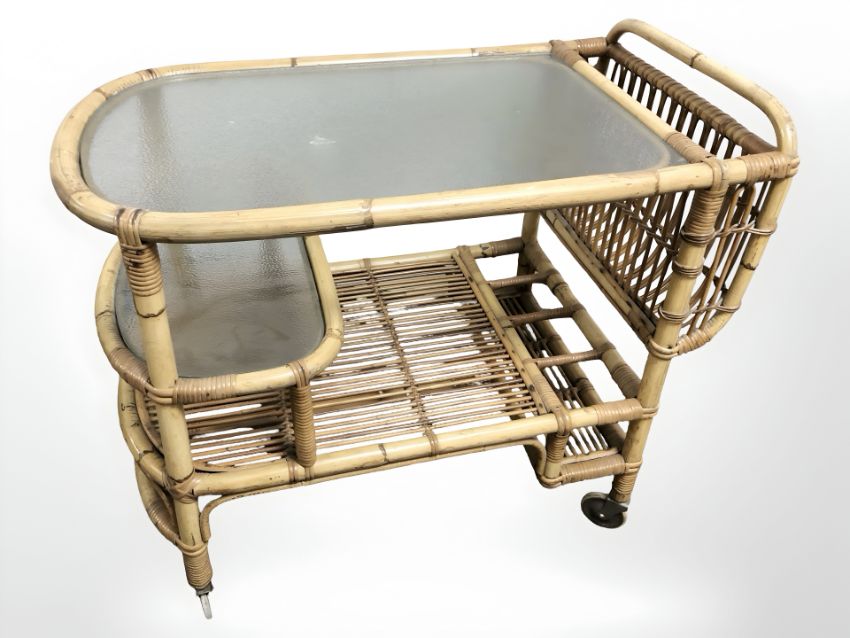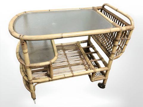 20th century wicker serving trolley with textured glass shelves, length 80 cm