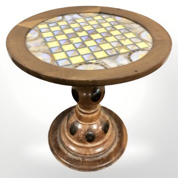 A circular walnut and butterfly wing chess board table, diameter 58 cm.