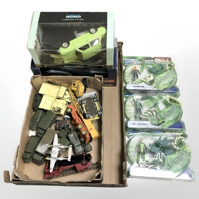 A group of play worn die cast vehicles including Dinky, military vehicles, three Mattel Green Lantern figurines, 1/18th scale die cast vehicles, etc. (1 box)