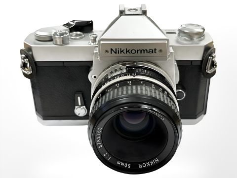 A Nikkormat 35mm camera with Nikkor 50mm 1:2 lens.