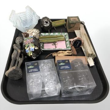Various items including shot glasses, carved hardwood man figure, pig money box, hand fans, Cotswold quail figure