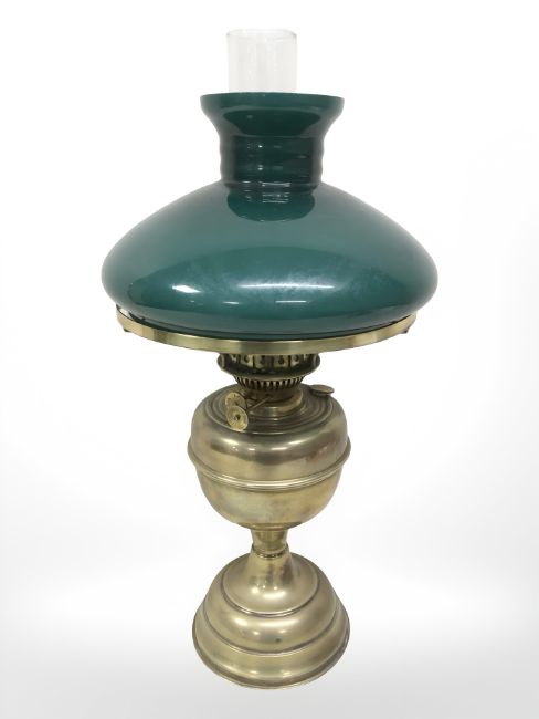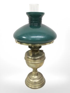 A brass Duplex oil lamp with green glass shade, height 52 cm