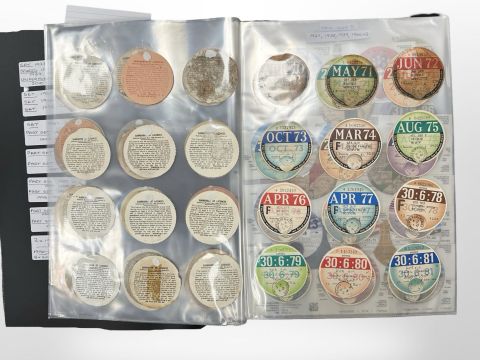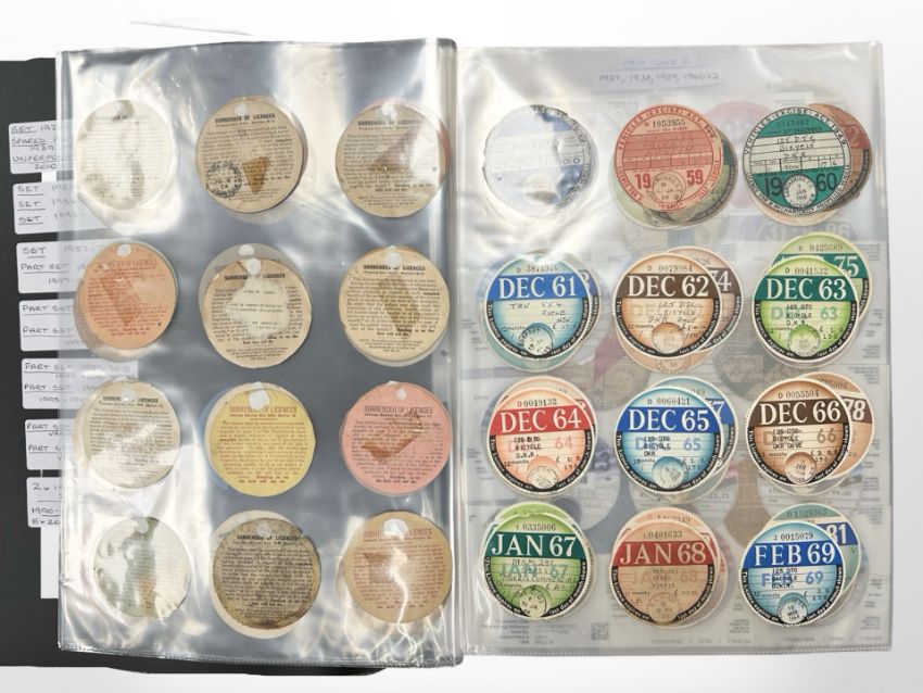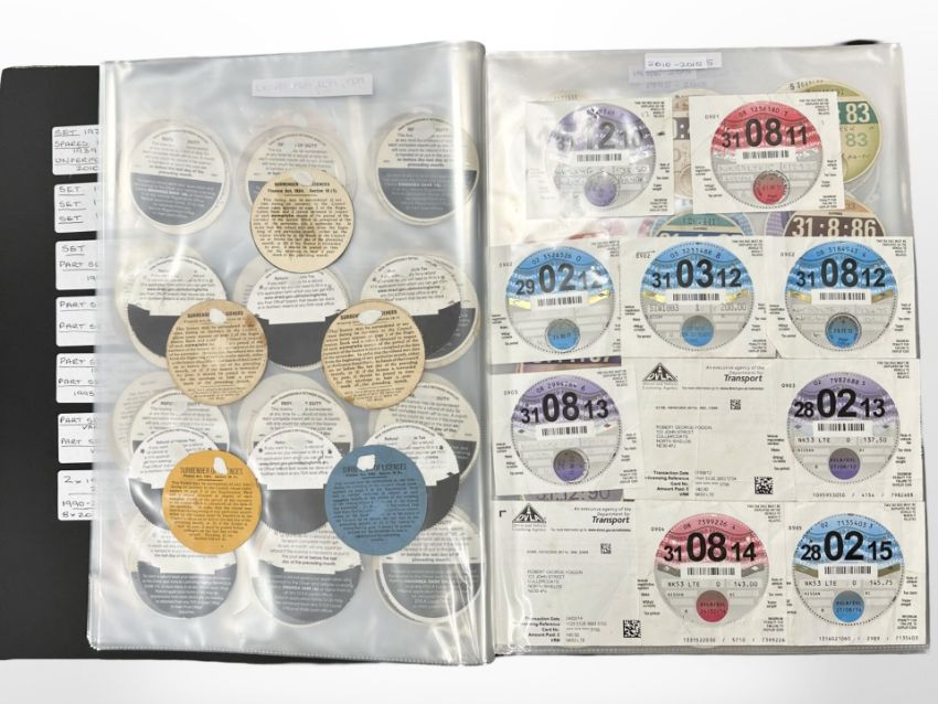 An extensive collection and of significant interest to velologists : Four hundred and fourteen UK vehicle licence tax discs, dating from 1923 through to 2015, with many examples in running sets and part sets including unperforated examples, contained in one file.