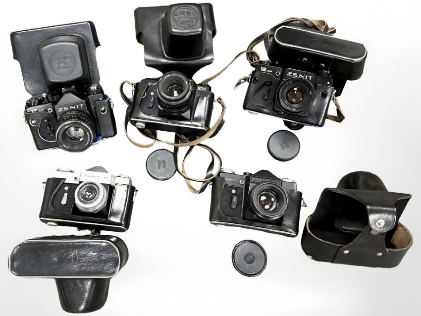 A small collection of Russian Zenit 35mm cameras including Zenit-B with Industar-50 3.5/50mm lens, Zenit-E with Helios-44-2 2/58mm lens, Zenit 12XP with Helios-44M 2/58mm lens, Zenit EM with Helios-44M lens and Zenit 12 XP with Helios-44M-4 2/58mm lens.