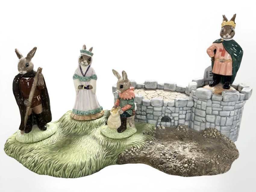 A Royal Doulton Bunnykins Robin Hood Collection stand containing figurines Little John, Maid Marion, Will Scarlett and Prince John