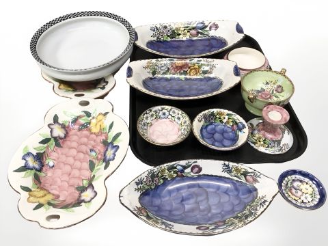 A group of Maling lustre ceramics including Gondala dishes, squat candlestick