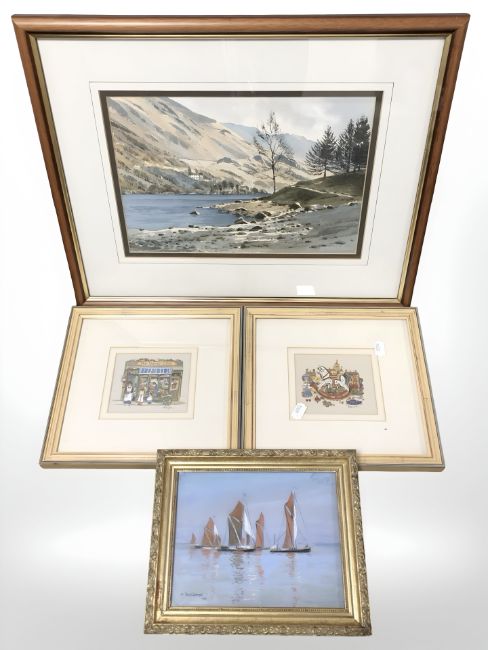 20th Century School : Buttermere, watercolour, indistinctly signed, 22 cm x 32 cm, together with a further pastel drawing of sailboats and two Diane Elson prints.