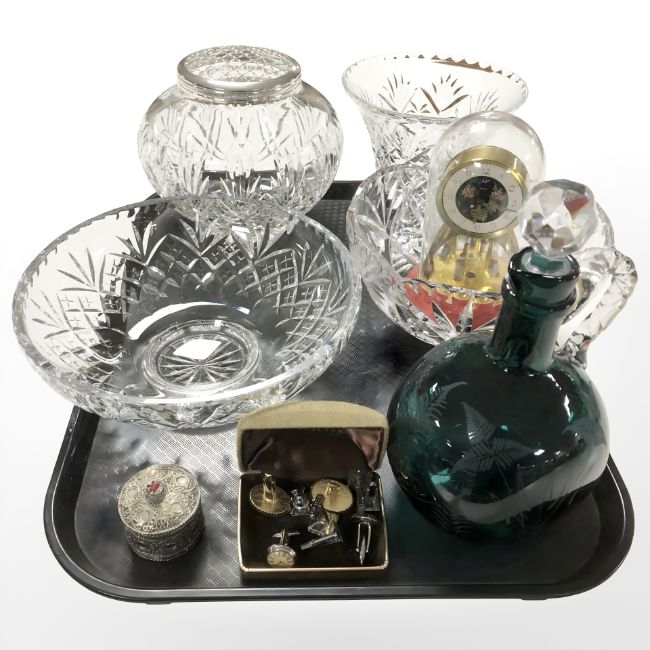 A group of crystal bowls, clock under dome, etched glass decanter with stopper, eastern white metal filgree box and cufflinks