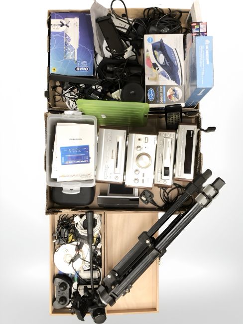 Assorted home electricals, pair of binoculars, Techincs hifi system, camera tripod etc (3 boxes)