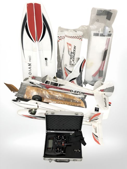 A group of model aircraft/glider model parts, aluminium case containing Spektrum DX 6 remote control etc (2 boxes)