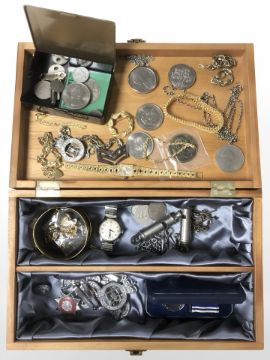 A two division box containing Crowns and other coins, police badges, medal, lady's Avia wristwatch, whistles etc