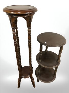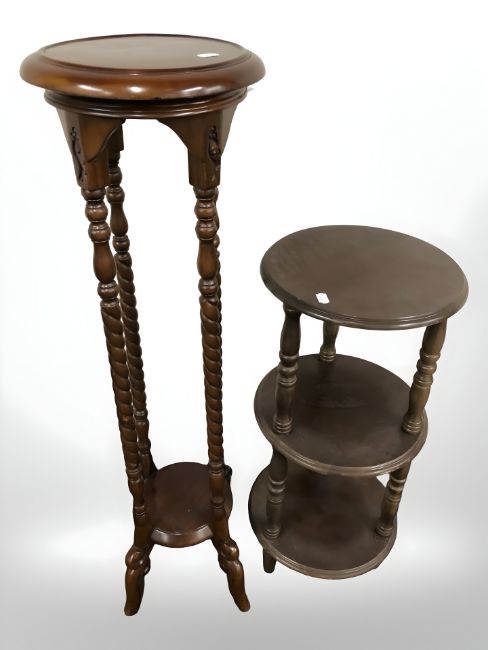 A reproduction mahogany jardiniere stand and a further three tier stand.