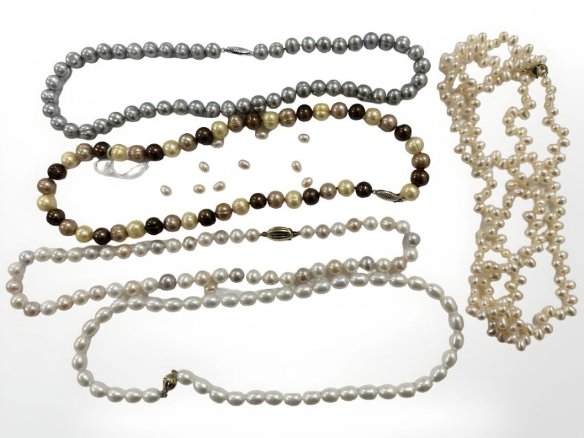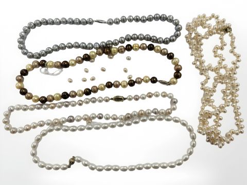 Two pearl necklaces with 14ct gold clasps and three others with 9ct gold clasps (one broken)