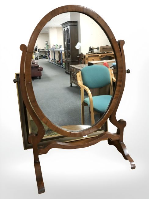 An early 20th century mahogany oval dressing table mirror, height 66 cm.