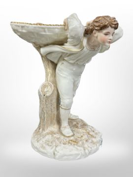 A Royal Worcester compote modelled as a boy carrying a woven basket, shape number 962, date letter for 1884, 21cm high.