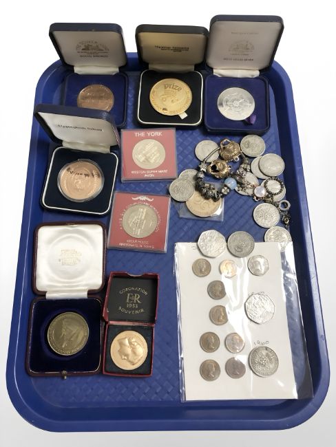 A group of pre decimal coins, medallions, charm bracelet, etc.