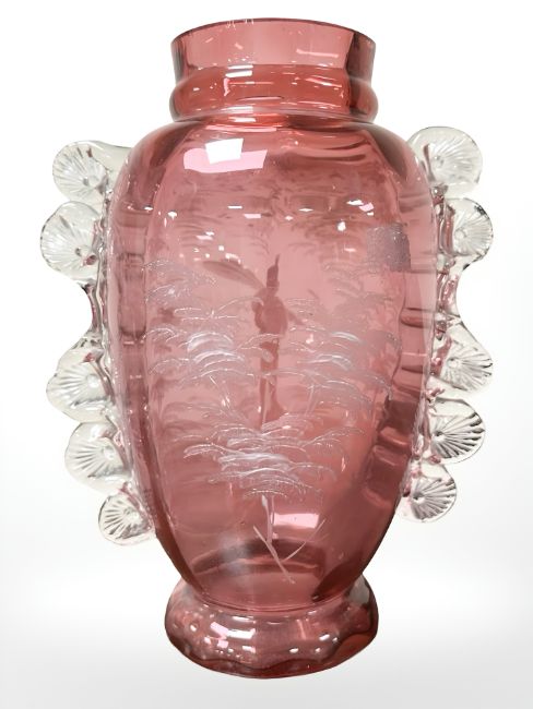 A Victorian Mary Gregory-style twin-handled cranberry glass vase, with hand-painted decoration depicting an oarsman, height 28 cm.