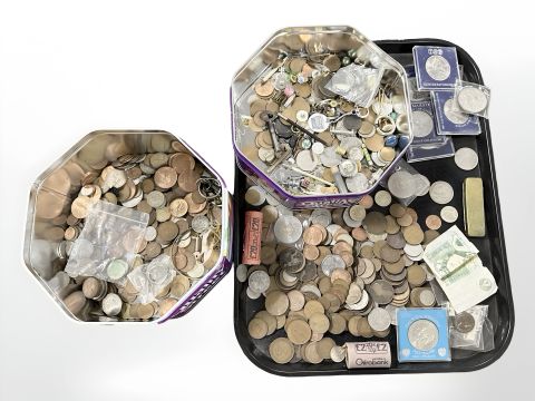 Assorted pre decimal coins mostly copper, crowns, some pre 1947 silver content, costume jewellery, old £1 coins, etc