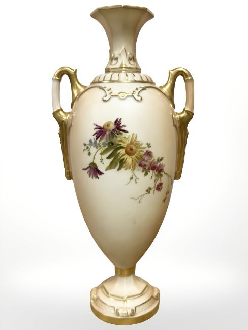 A Royal Worcester Neo-Classical vase, painted with flowers amongst foliage, date code for 1909, height 26cm.