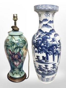 A Moorcoft table lamp base, height 45 cm, together with a contemporary oriental blue and white baluster vase. (both heavily restored)