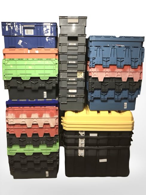 A large quantity of stackable plastic storage containers with lids, largest 87 cm long