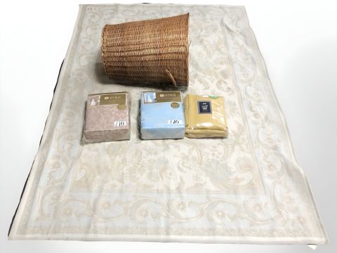 A machine made rug, two pairs of fully lined Jacquard curtains, 225 cm x 225 cm, and a wicker laundry basket.