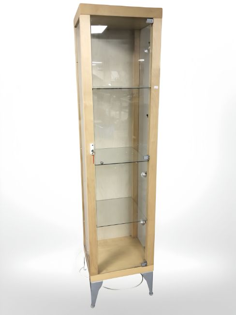 A contemporary square illuminated display cabinet with glass shelves and key, width 45 cm.