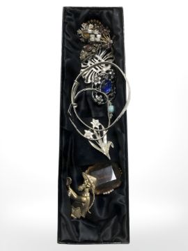 A group of costume brooches and bangles.