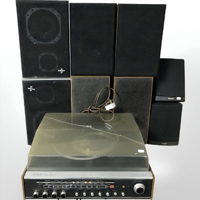 A GEC Sound Deck stereo system (lid cracked), four pairs of speakers