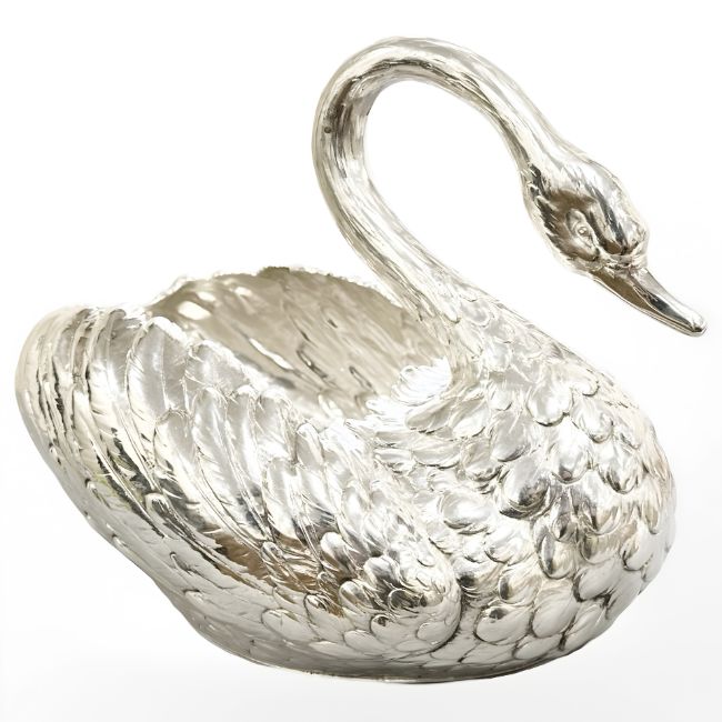 A fine German silver swan table centrepiece, suitable as an ice bucket or jardinière, realistically modelled with the wings forming the bowl or vase, engraved to the underside 'Concours hippique Berlin 1906' (Horse show), with German silver marks, 800 grade silver, 35cm in length, 25cm high.