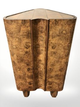 An Art Deco burr walnut two door corner cabinet, height 80 cm