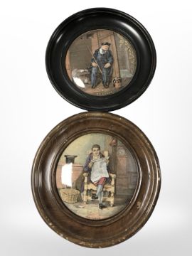 Two Prattware pot lids in circular wooden frames.