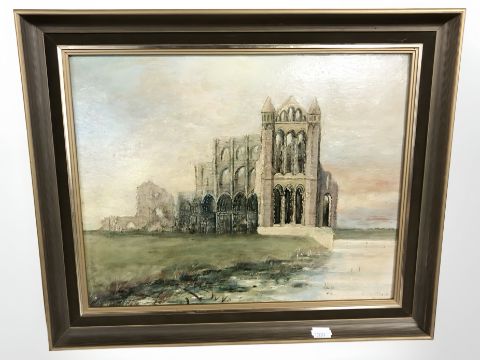A pair of Victorian bead work and ebonised foot stools, diameter 29 cm, together with an oleograph depicting an abbey by S. Dring.
