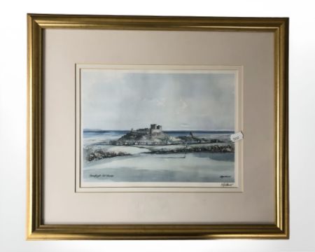 Assorted pictures and prints, 19th century hand coloured engravings, Tom McDonald print of Bamburgh golf course, etc. (1 box)