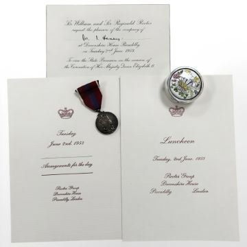 An official 1953 coronation medal with coronation day invitations relating to Sir William and Sir Reginald Rootes, together with a silver and enamel circular lidded box commermorating the wedding of Charles and Diana, 53g.