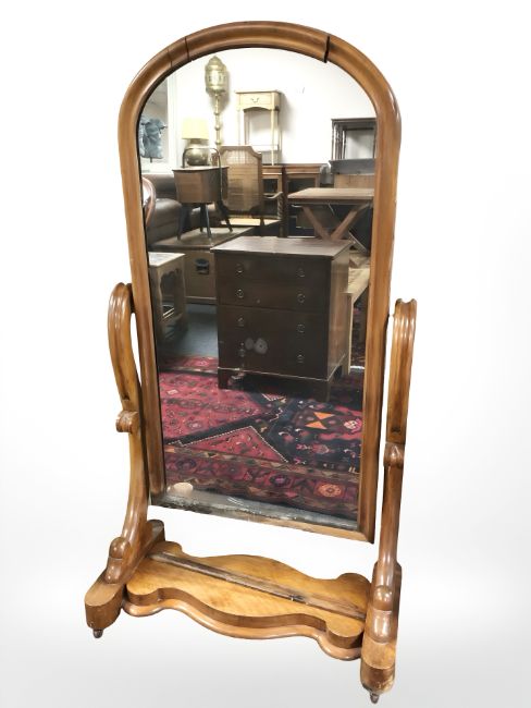 A Victorian walnut-framed cheval mirror, width 75 cm.