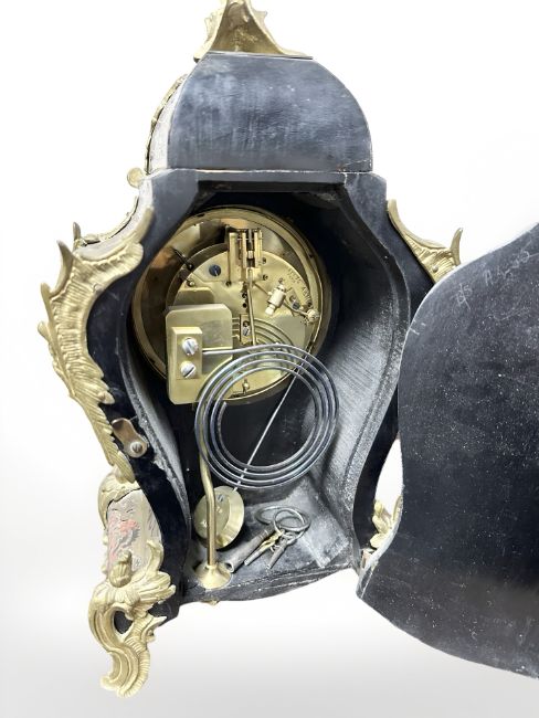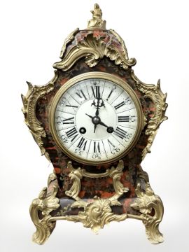 A 19th century French Louis XV style boulle and gilt metal mounted mantel clock, the movement by A. D. Mougin, striking on a gong, with pendulum and key, height 36 cm.