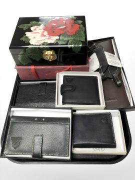 A group of new Toucan leather wallets and passport cases, and an oriental lacquered jewellery box.