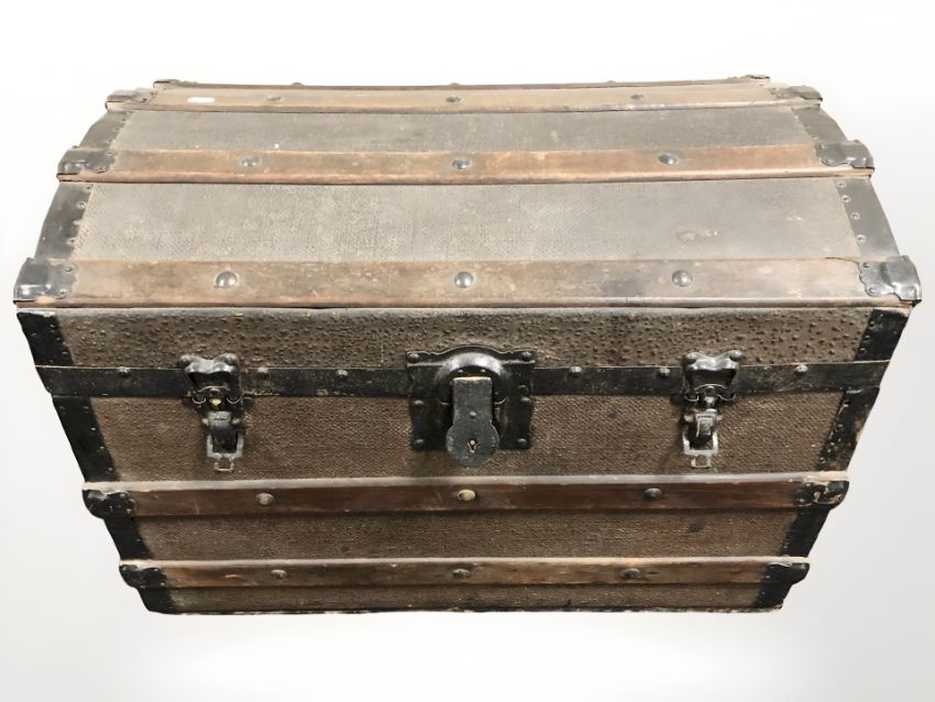 A wooden and canvas bound domed trunk, width 69 cm