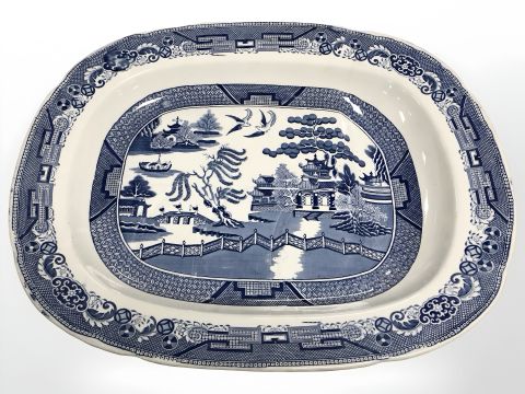 A large Middlesborough Pottery blue and white transfer printed willow pattern meat draining plate, width 50 cm.