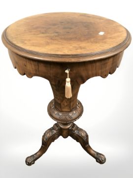 A Victorian figured walnut circular pedestal work table, height 75 cm.