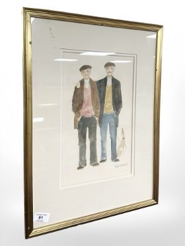 Terence McArdle : Two men with a whippet, watercolour, 20 cm x 33 cm.