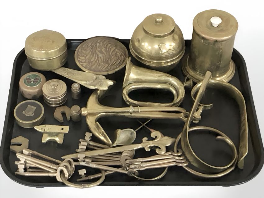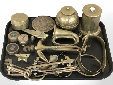 A group of brass wares including three key rings, miniature bugle, lidded boxes, anchor, etc.